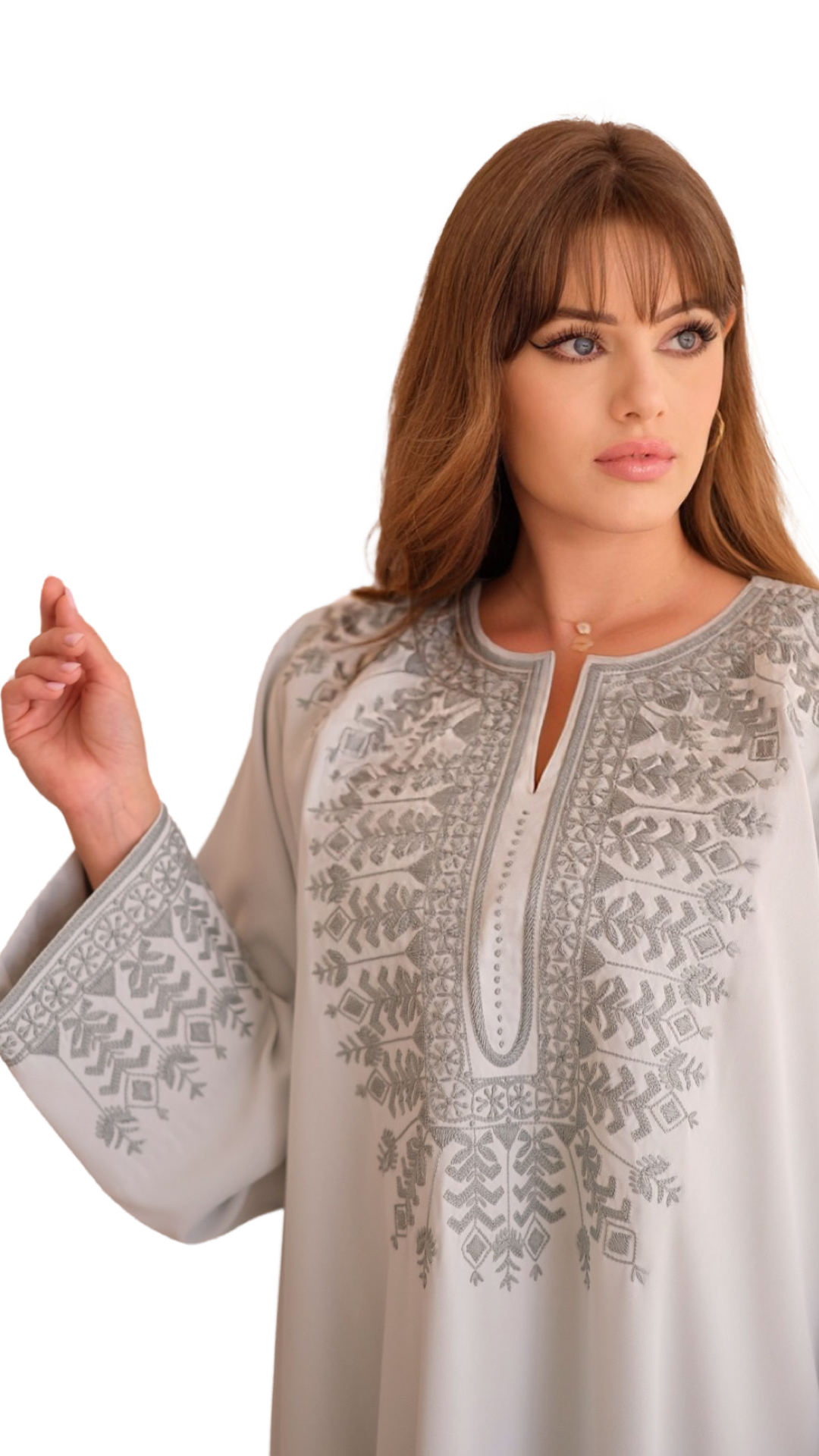 جلابية بخام الكريب مع تطريز على الرقبة والأكمام